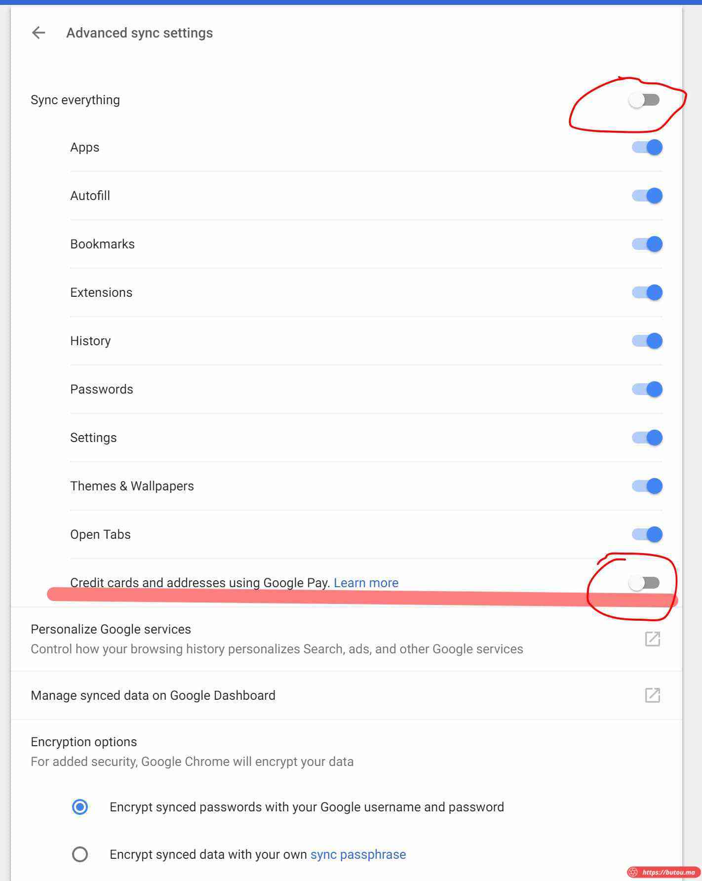 • 打开同步选项,先关闭同步所有选项,再手动分别打开各个同步项,除了最后那个 “Credit cards and addresses using Google Pay”。
